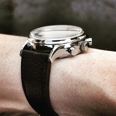 « Plus pragmatiquement, le fond du boîtier et la couronne sont en titane poli, afin de diminuer les risques d’allergie et d’alléger l’ensemble (le poids total étant de 120 g). »