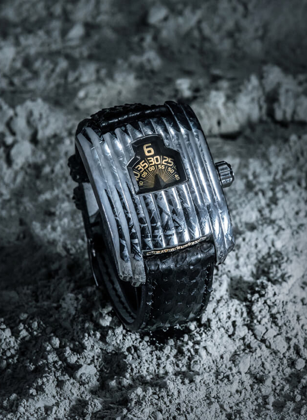 - David Rutten revisite la montre à guichet des années 30, en laissant la place d’honneur à la météorite.