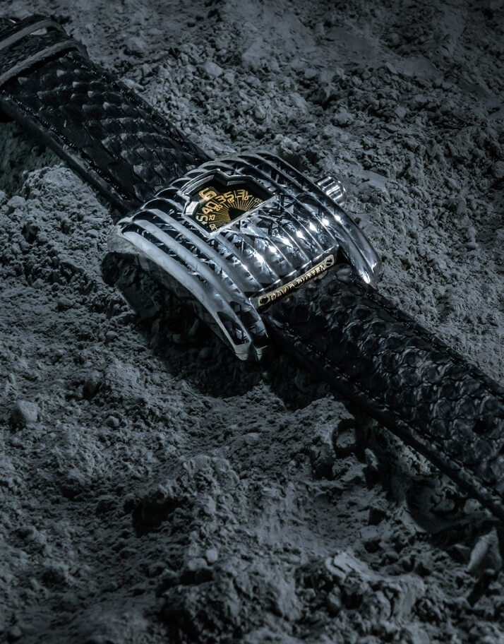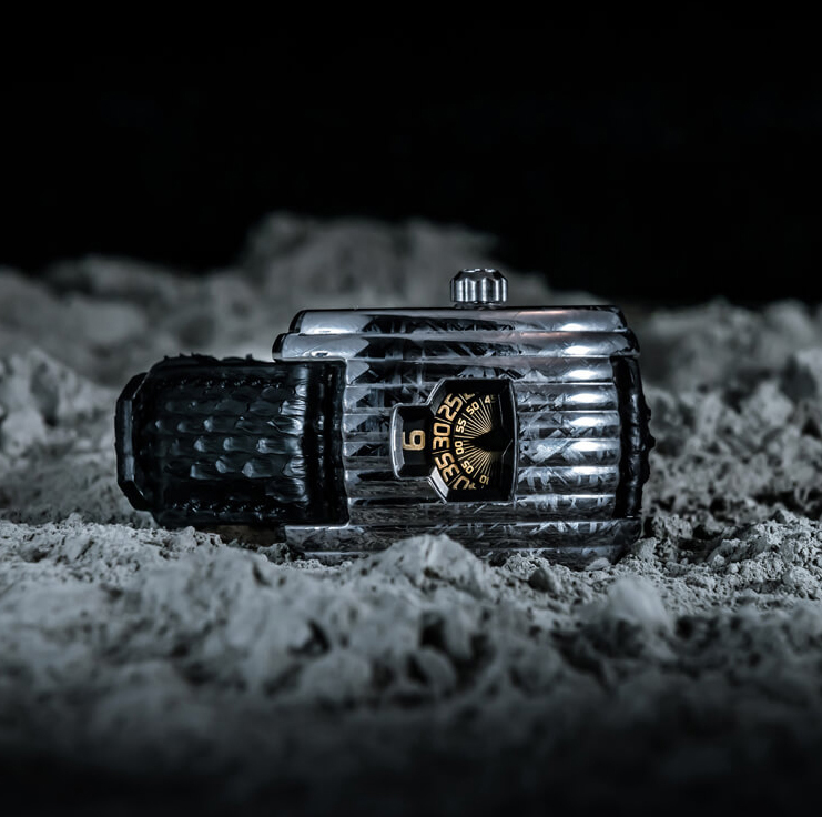 Cette montre imaginée par David Rutten, possède un boîtier usiné dans une météorite métallique qui porte le nom de MUO NIO NALUSTA.